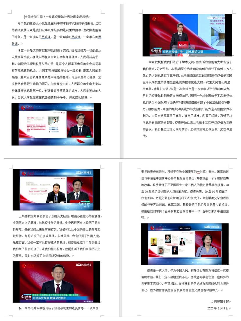 值此三月,草长莺飞,春意且浓,就在举国百姓共同抗疫的时刻,教育部社科司与人民网联合组织的“全国大学生同上一堂疫情防控思政大课”,将高校思想政治理论的教学优势转化为支持防疫斗争的强大力量。为积极响应校团委的号召、配合校团委的工作,我院团总支组织全院师生线上收看“思政大课”,向全国各地的具有雷锋精神的抗疫英雄学习。