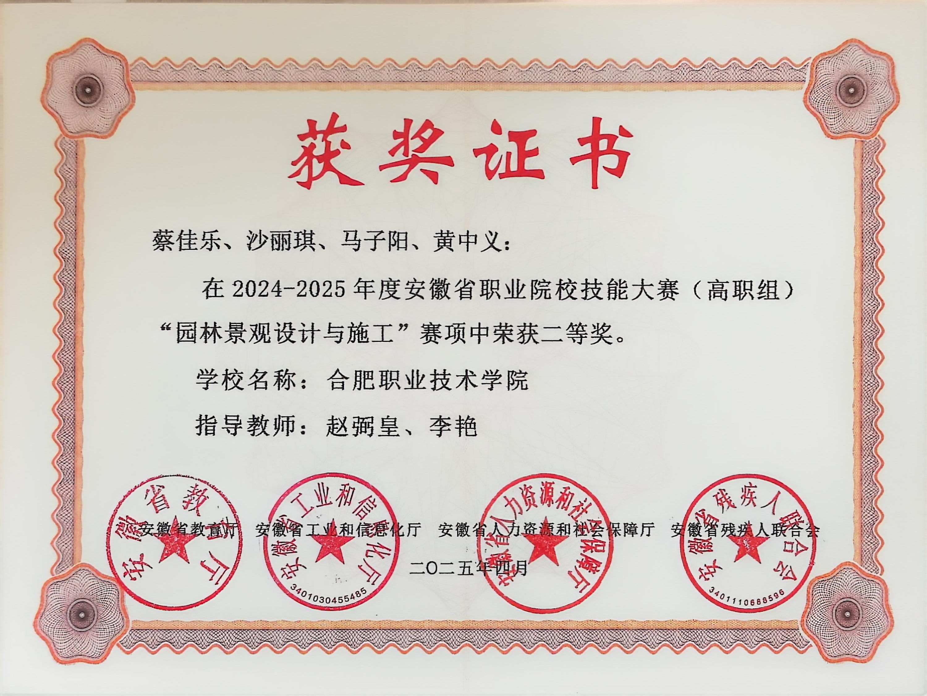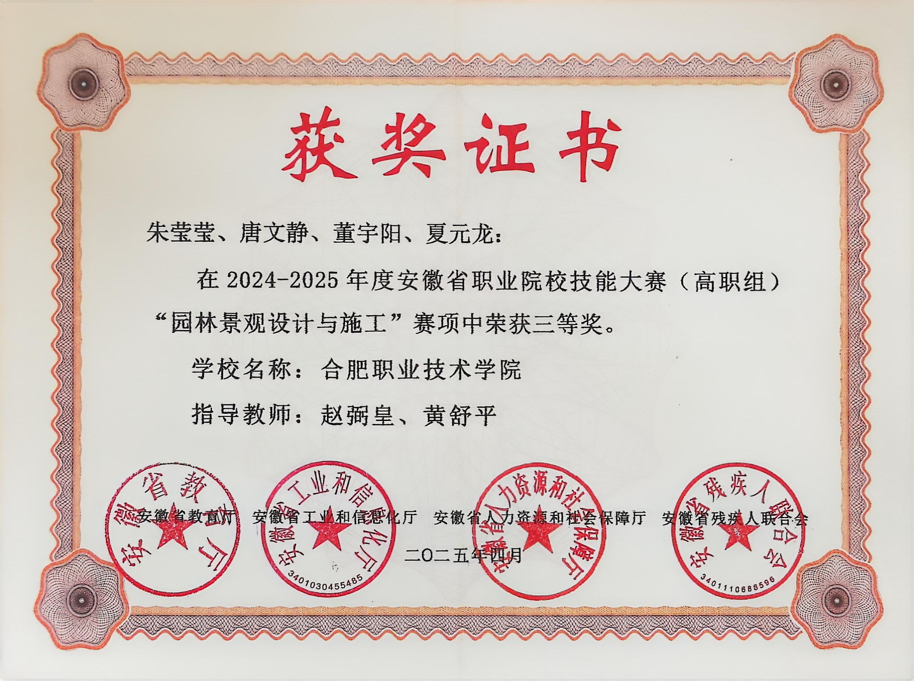 【办学成果】通过校企联合培养,教师与学生的专业能力和职业素养不断增强,专业教学团队于2018年获得“全国职业院校职业技能大赛教师教学能力比赛”一等奖,2019年获“安徽省教学能力比赛”二等奖。2020年,获得“安徽省教学成果奖”一等奖,4名教师获“安徽省教坛新秀”、1名教师获“安徽省优秀教师”等荣誉称号。近三年,学生参赛队共计在安徽省职业技能大赛“园林景观设计与施工”项目获得二等奖1项,三等奖4项;“花艺”项目获得二等奖1项,三等奖3项。