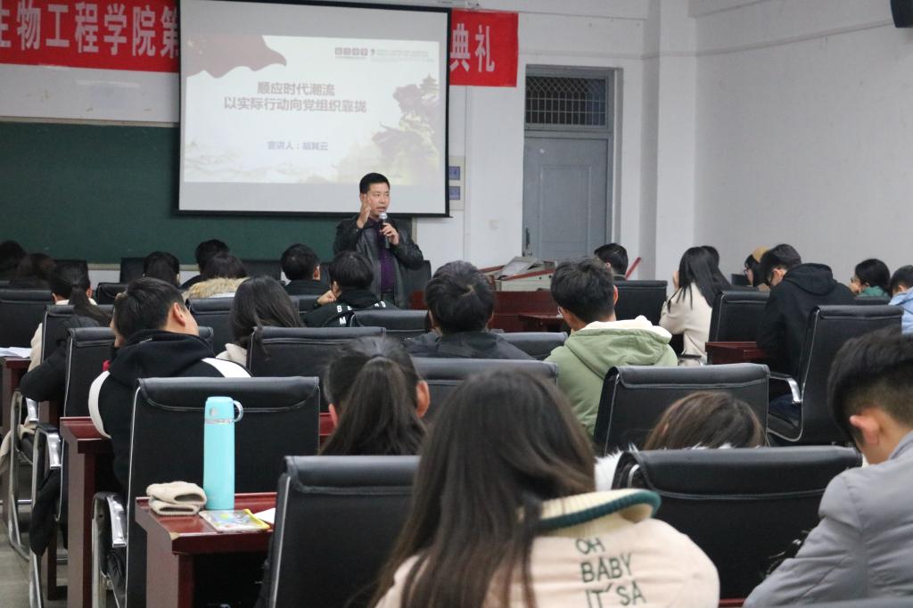 会后,校党委副书记胡其云以《顺应时代潮流,以实际行动向党组织靠拢》为题,为全体学员上了第一堂党课。当下,学生们正处在改革开放40周年的时代背景下,新时代赋予了学生们新的使命、责任与担当,习近平总书记亦在各种重要场合对青年一代提出厚望。胡书记循循善诱,与学生们亲切攀谈,他指出:当下,高校正在进行教育教学改革,我校也在大力进行教风、学风建设,如何以实际行动向党组织靠拢,是学生们需要不断思索并实践的课题。一是要加强政治理论学习;二是培养良好的道德品质;三是勤奋学习,积极参加社会实践。
