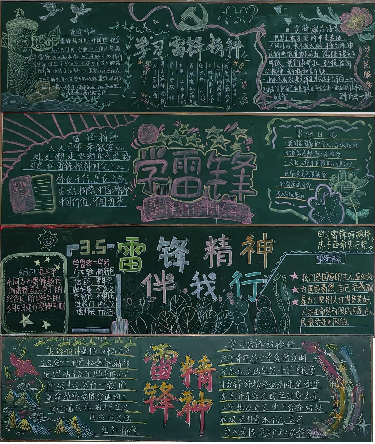 同学们充分发挥自己的创意和才华,精心设计、制作了一期内容丰富、形式多样的黑板报。这些黑板报以雷锋同志的生平事迹、雷锋精神的时代内涵、学雷锋志愿服务活动等内容为主题,展现了同学们对雷锋精神的理解和感悟。同学们通过精美的图片、生动的文字、感人的故事,展现了雷锋同志助人为乐、无私奉献的精神风貌。