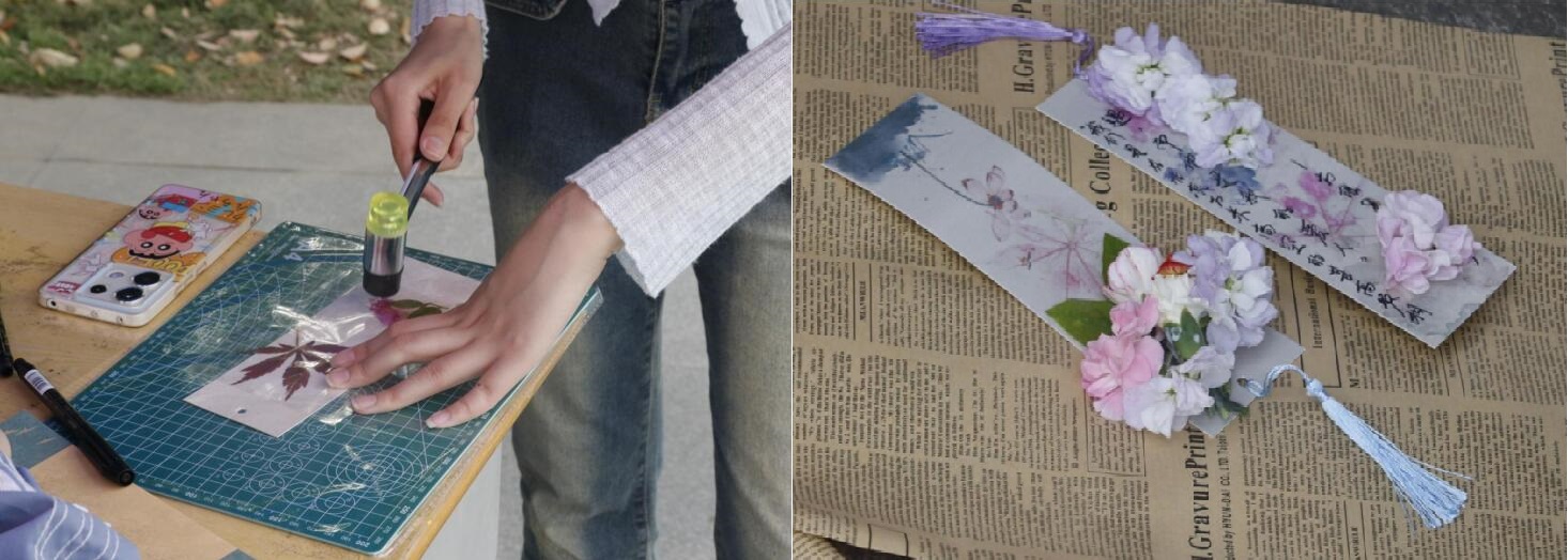 探寻植物拓染自然之美的书签制作活动。植物拓染作为一项古老的非遗技艺,通过敲打植物将色彩与形态定格于布帛之上,既能展现自然之美,又能传递手作温度。活动现场,同学们亲手选取心仪的植物叶片,轻置书签之上,通过传统的印染技法,自然的色彩与纹理跃然纸上,每一笔一划都是大自然最真挚的馈赠。这个过程不仅锻炼了同学们的动手能力,也让他们在实践中感受到了自然的魅力。