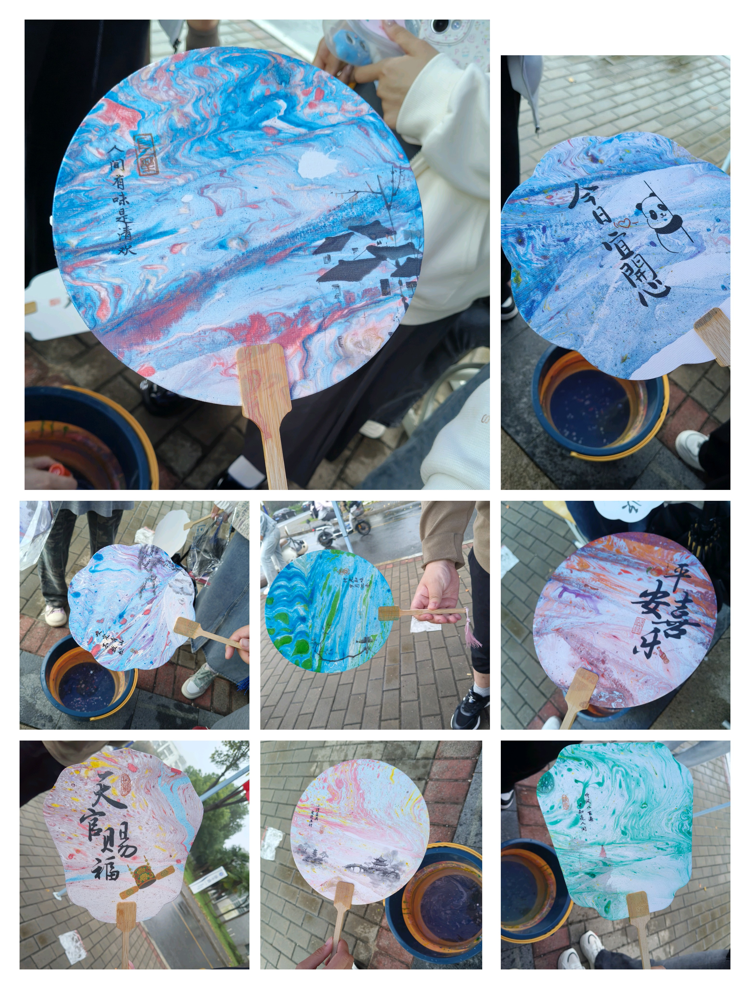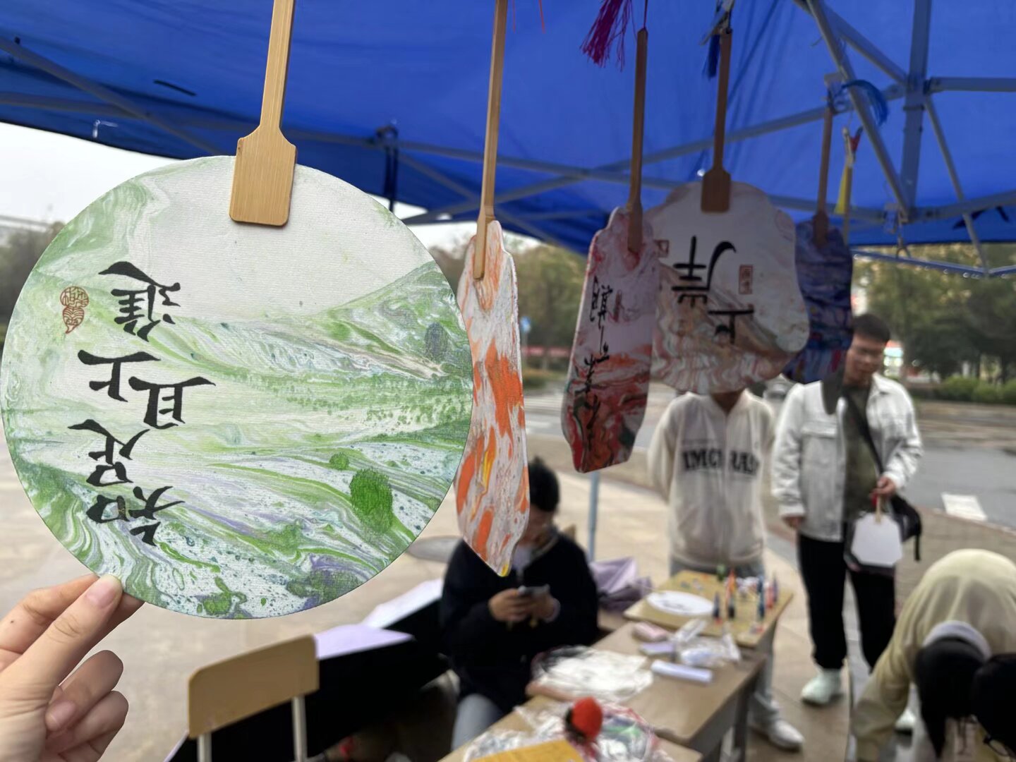 二食堂门口的 “非遗漆扇 DIY” 成为焦点,同学们在志愿者指导下体验 “漂漆” 技法,将大漆滴入水中形成纹理,再提扇定格独一无二的纹路。大一新生周同学手持漆扇兴奋地说:“每把扇子都是孤品,就像我们的青春!”