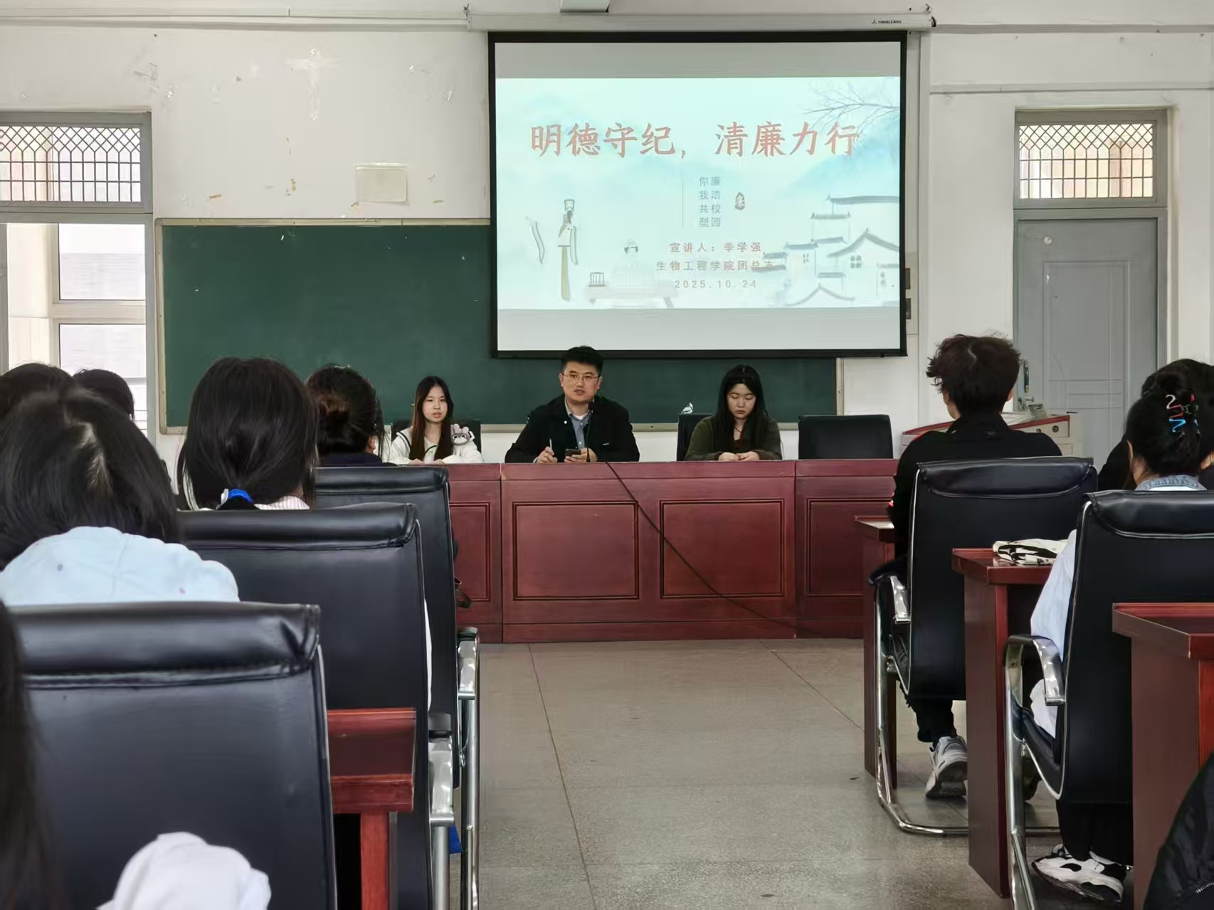 为了深入推进廉洁文化建设,增强我校学生的廉洁意识和自律精神,KY开元集团官网入口团总支于2025年10月24日在生化楼A305会议室开展了“明德守纪,清廉力行”主题团课。本次团课由院团总支书记季学强老师主讲,所有2025年下半年入团积极分子参加。