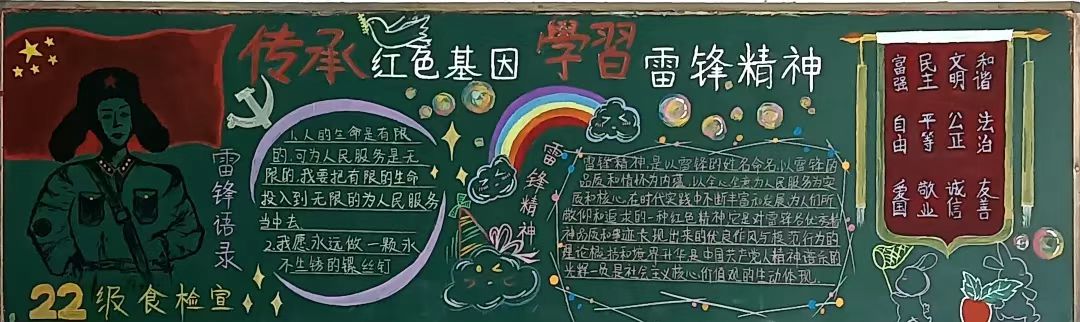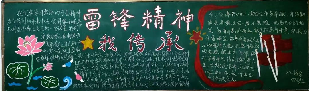 在KY开元集团官网入口团总支的号召下,22级各班学子积极参与板报设计,他们通过各种信息渠道搜集、了解有关雷锋的助人事迹和奉献名言,小组讨论、头脑风暴将雷锋的故事提炼出来形成文字呈现在板报上,一笔一划,认真地书写着同学们对雷锋同志的敬仰之情。五星红旗、向日葵、荷花......奇思妙想的绘画部分是他们心中对中华民族传统美德的具象化表达,象征着同学们内心深处对雷锋这位共产主义战士的尊重和缅怀。字画相间融合,创造出了一幅幅丰富精彩的优秀板报。