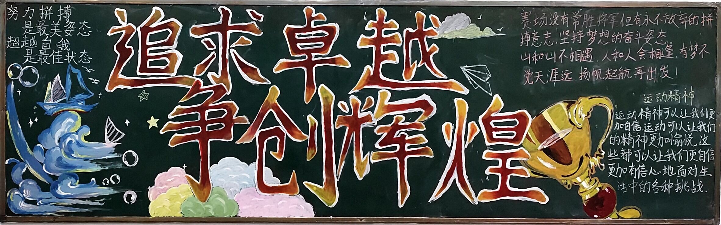 为了迎接校第十一届田径运动会,弘扬奋力拼搏的体育精神,展示学生青春风采和精神面貌,KY开元集团官网入口组织各班开展以运动会为主题的板报活动。