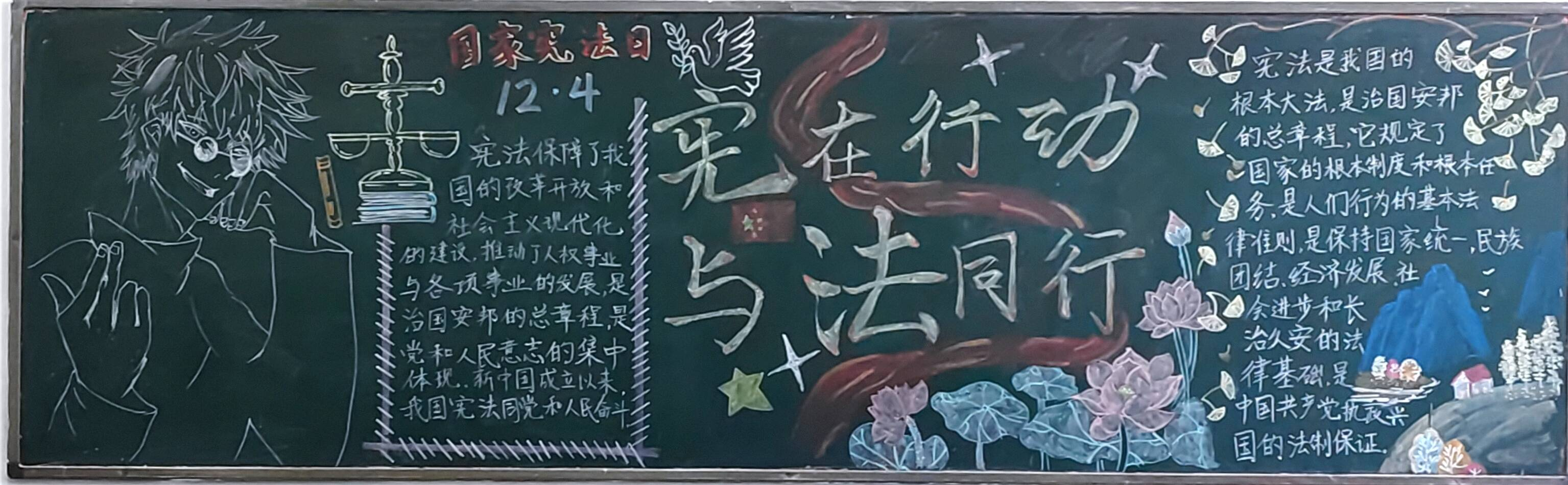 此次活动中,同学们都积极参与设计,板报内容积极向上,紧扣本次学习宣传宪法主题,板报上所展示的宪法,国旗,天平也有力地突出宪法公平公正的主题,彰显宪法权威。板报内容生动有趣,让同学们更加形象的了解宪法并宣传宪法,向我们展示了宪法是国家法治之根本,宪法保护我们的权利。同学们用画展示出他们心中的宪法,以及他们心中宪法的重要性,使此次活动更加有意义。
