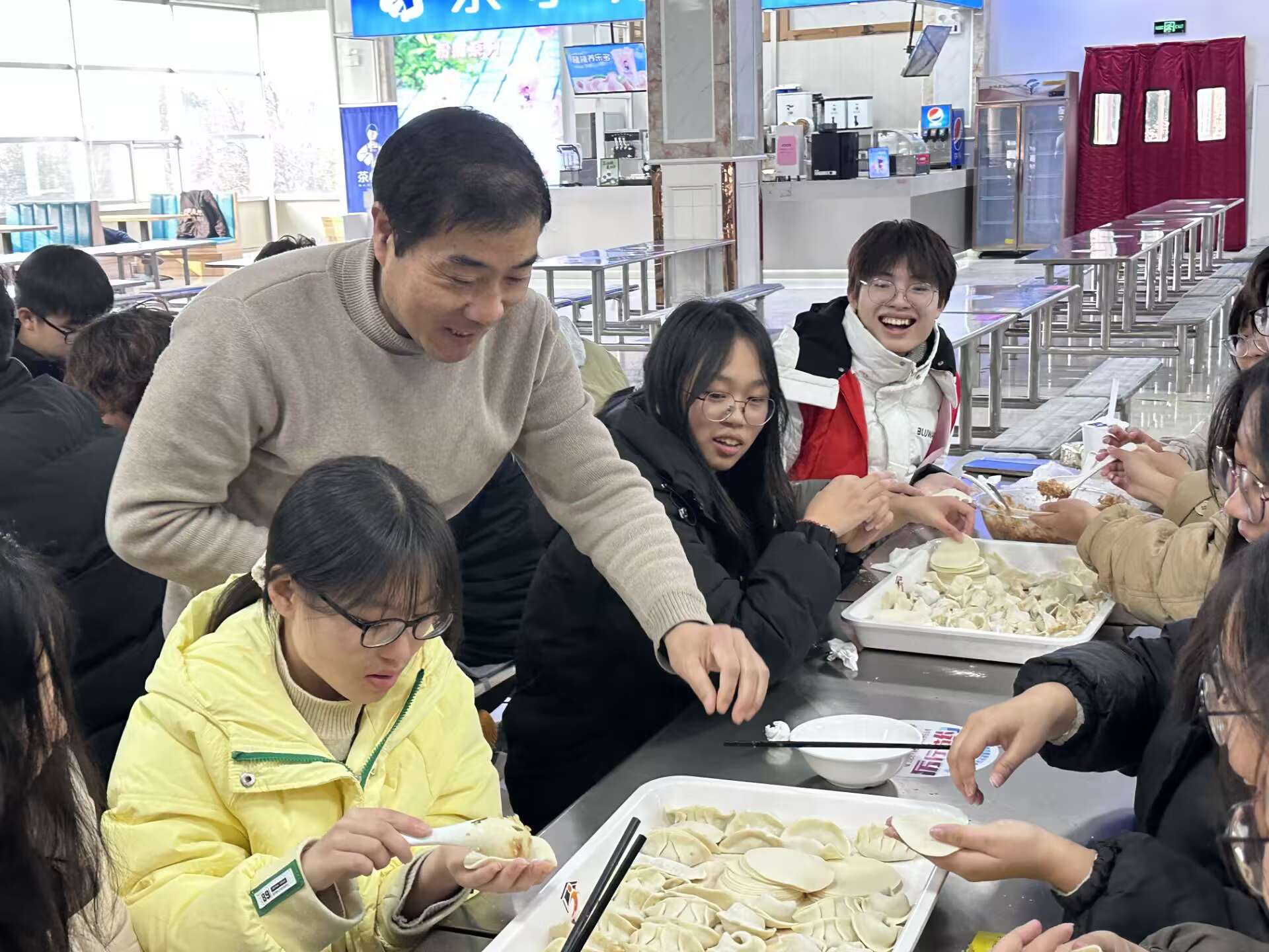 活动第一项师生共同参与包饺子比赛。比赛氛围非常热烈,同学们都非常投入在包饺子中,包出的饺子也是风采各异。包饺子比赛结束后进行了多项有趣的游戏。首先是"听歌识曲”游戏,同学们纷纷猜出歌曲的名字,有的同学非常擅长猜歌名,能够迅速准确地回答出歌曲的名称,赢得了掌声和喝彩。接着是“抓鸭子"游戏,同学们要对应的鸭子数量喊出“嘎”,这个游戏非常考验同学们的专注力和反应能力,最后是“抢板凳"比赛,同学们纷纷围着几个板凳转圈,当音乐停止时,有的同学反应灵敏坐上板凳进入下一轮,而没坐上板凳的同学就被淘汰出局了。这些游戏让同学们放松了心情,也增加了彼此之间的友谊和感情。食堂充满了欢声笑语和快乐的氛围。