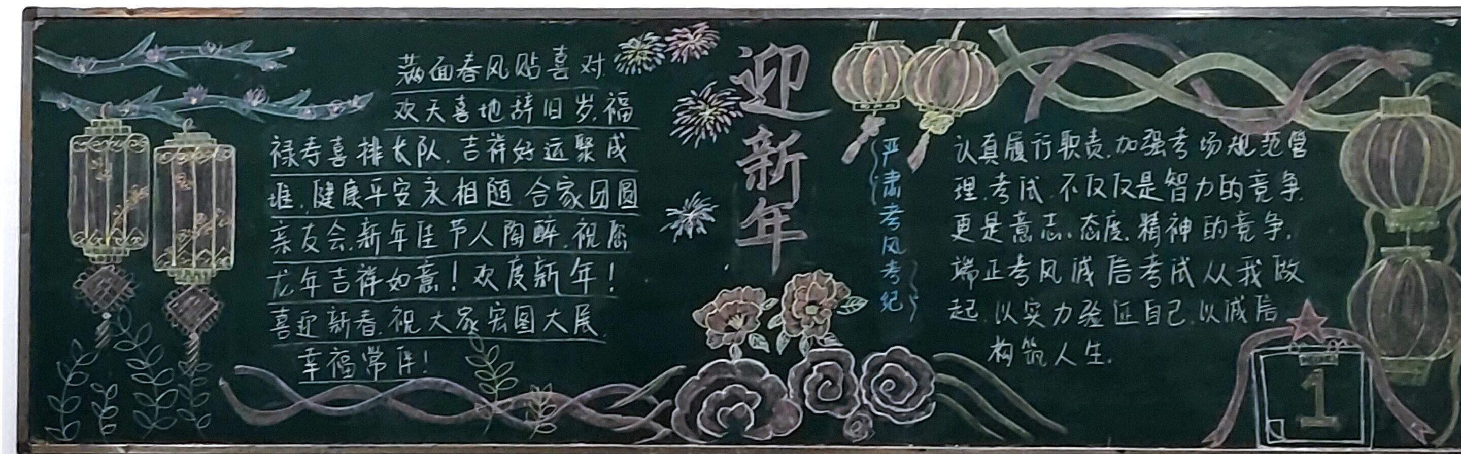 此次板报内容主要分为两部分,一个是喜迎新年,2024年即将来到,面对新的一年,同学们会有新的目标和新的愿望,可结合传统元素对黑板报进行创作。另一个主题是严肃考风考纪,学期即将结束之际,同学们将面临期末考试。不仅是对学习的总结,更是一个很好的对自己一学期所学知识的检测机会。其内容需要紧扣主题,积极向上。通过同学们辛苦积极的创作,板报内容丰富多彩。既展现了同学们对新年新气象的展望,也表现出对考试规则严格遵守的态度。板报中栩栩如生的龙,正如同学们一样龙图大展。在同学们画的鞭炮与烟花中,看到了璀璨夺目的大学生活。内容更能表达出同学们对期末考试的信心满满,正如同学们所说,诚信乃安身立命之本。