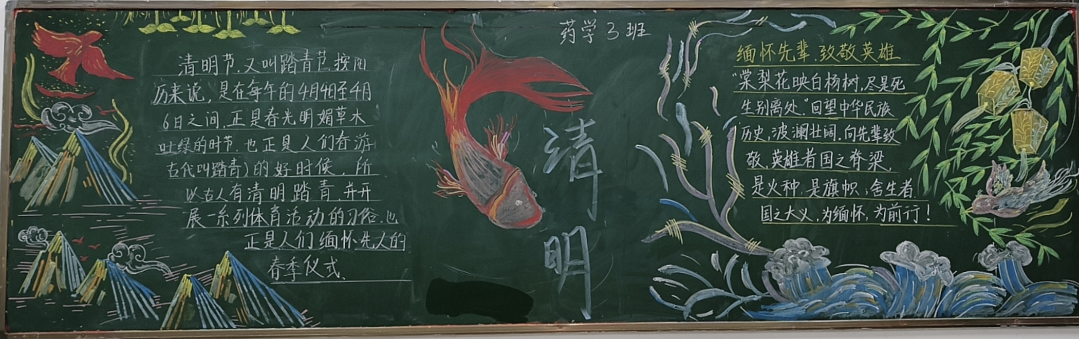 黑板报是校园建设的窗口,是展示班级文化的主要方式,同学们对清明节相关的内容展开了描述与绘画。各班级紧紧围绕主题内容精心准备,积极参加。