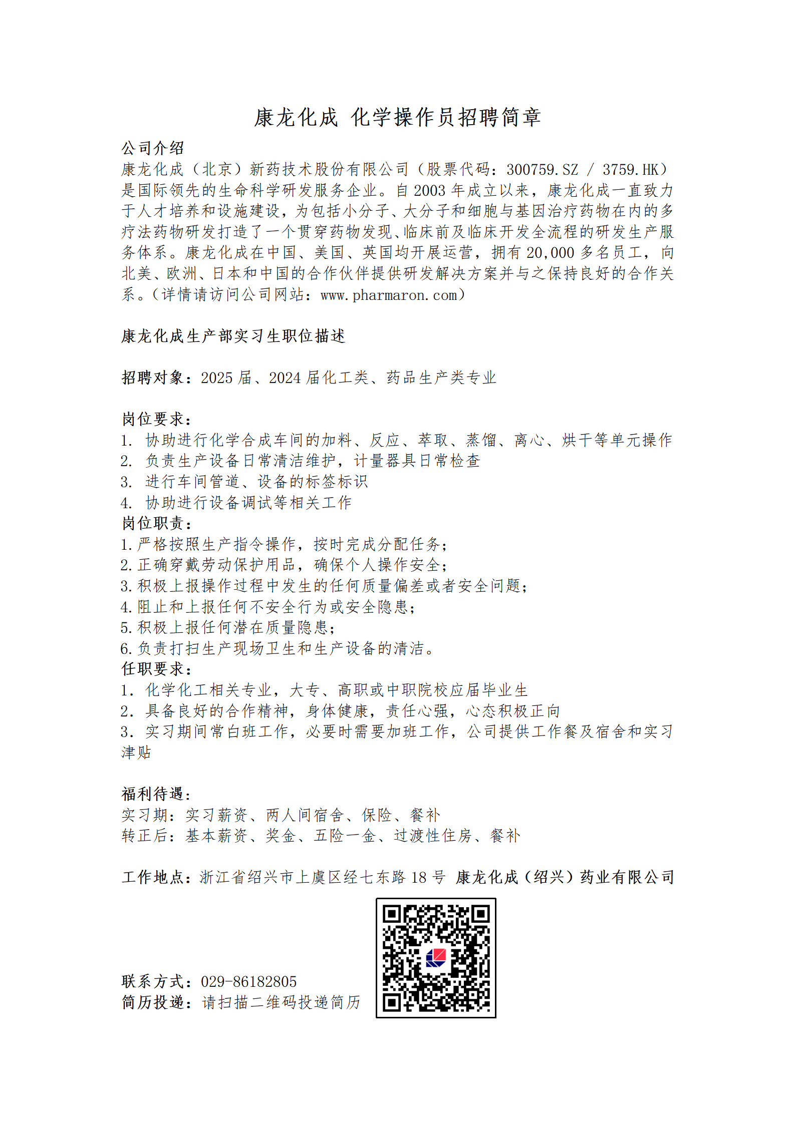 康龙化成化学操作员招聘简章